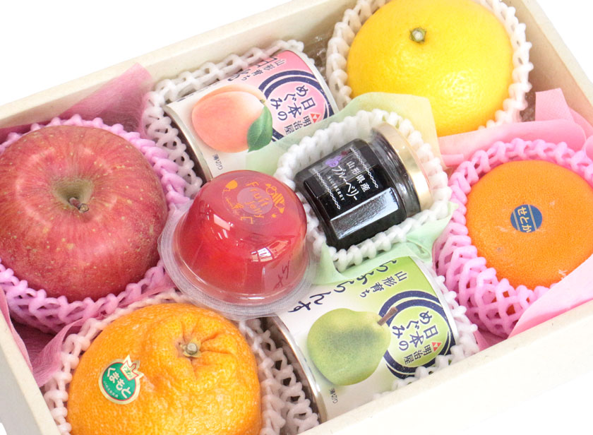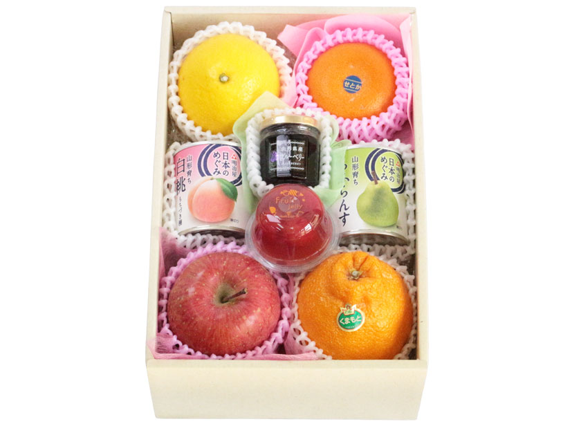 濃厚なコクと甘さから「柑橘の大トロ」とも呼ばれる柑橘・せとか、見た目のかわいらしさと味の良さで人気のデコポン、甘くてふわふわの白皮が特徴的な日向夏といった旬の柑橘類に、人気No.1りんごのサンふじ、見た目も華やかな国産フルーツゼリー、果実の味を生かした国産ブルーベリージャム、素材にこだわった国産フルーツ缶詰を詰め合わせたお祝いギフトです