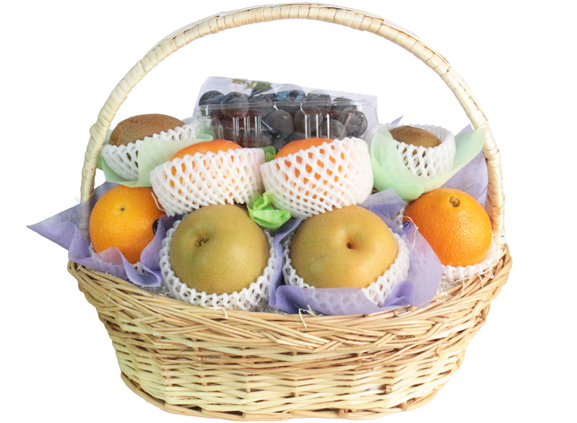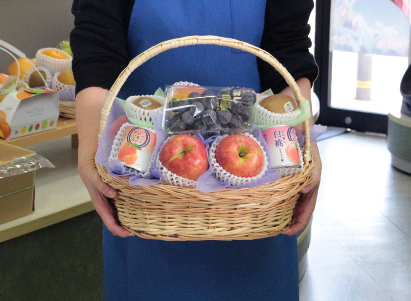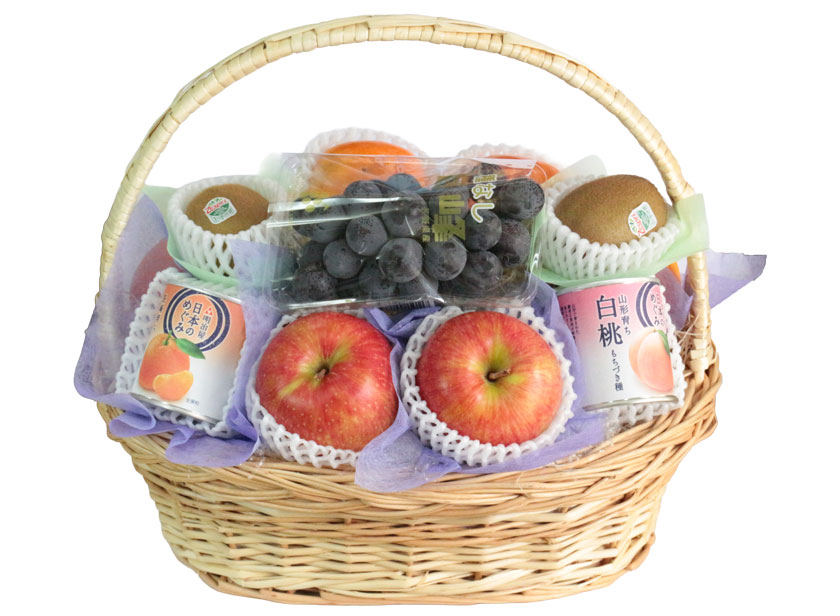 甘さと優しい酸味のバランスが絶妙な巨峰、甘くてジューシーなシナノスイートりんご、果汁たっぷりで爽やかな風味の南水梨、まったりとした甘みの柿といった旬の果物に、素材にこだわった国産フルーツ缶詰を添えたカゴ盛です。