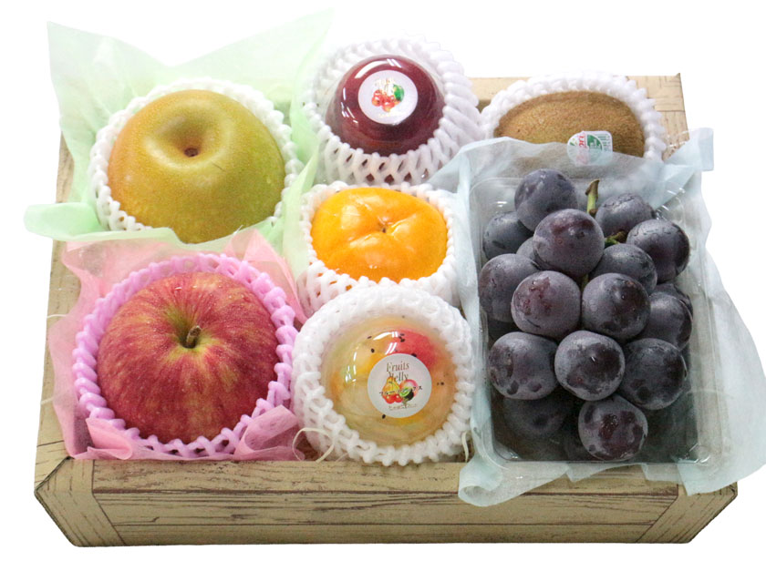 大粒で甘く、迫力のある見栄えと人気の高さから「ぶどうの王様」とも呼ばれる巨峰、果汁たっぷりの、みずみずしく、程よい酸味が甘さが引き立てる秋映りんご、季節を先取りするなどの旬の果物と、国産フルーツゼリーを、木目調の紙製トレーに盛り合わせました。