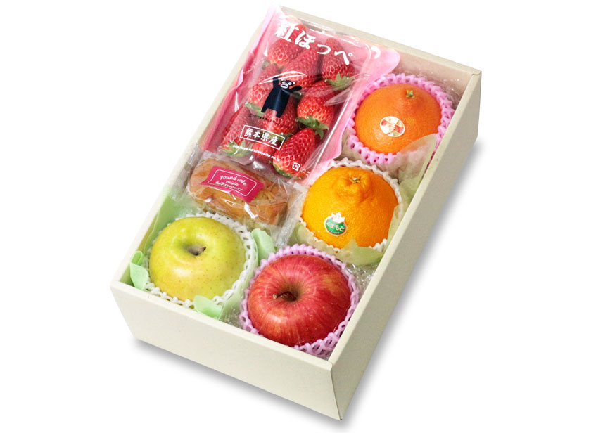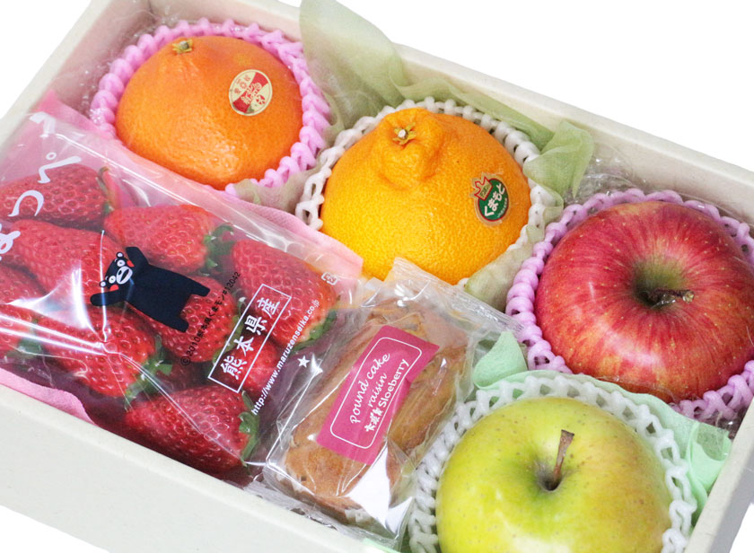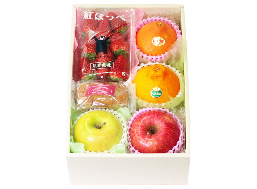 甘みと香りがひと粒に凝縮された国産いちご、とろけるような舌触りでゼリーのように滑らかな果肉の紅まどんな、驚くほどの甘さにほどよい酸味が加わったデコポン、旬のりんご2種(サンふじ・王林)に、特製パウンドケーキを添えた詰合せです
