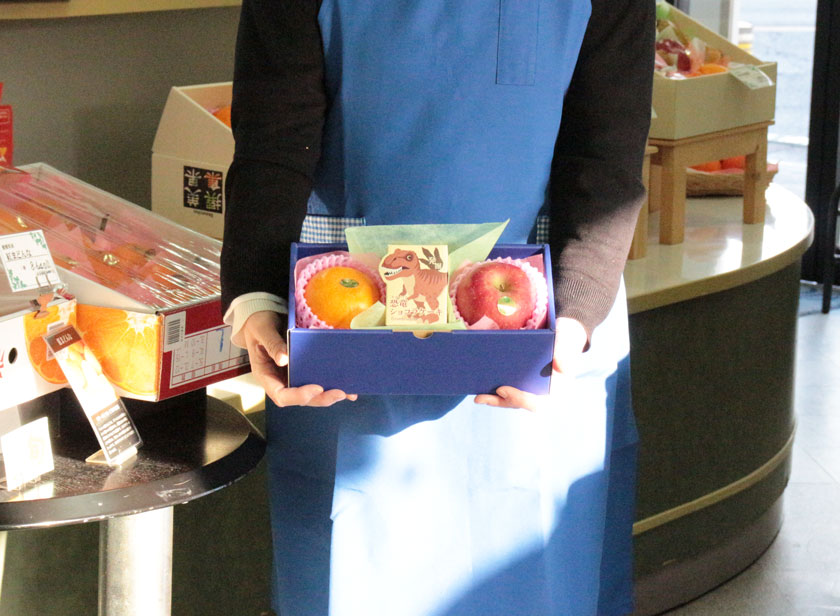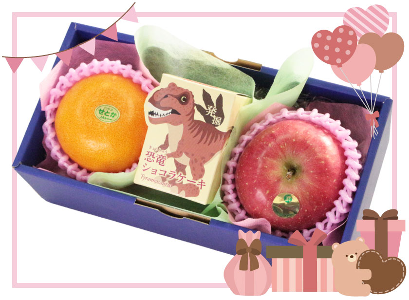 | 内容 | 佐賀産 せとか 1個 青森産 サンふじ 1個 Sloeberry 恐竜ショコラケーキ(チョコレート) 1個 |