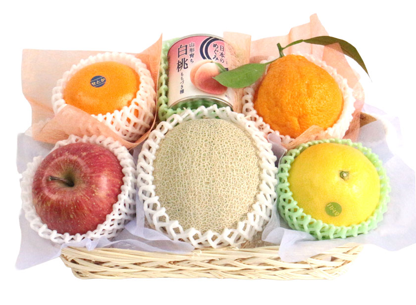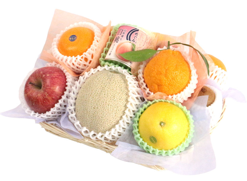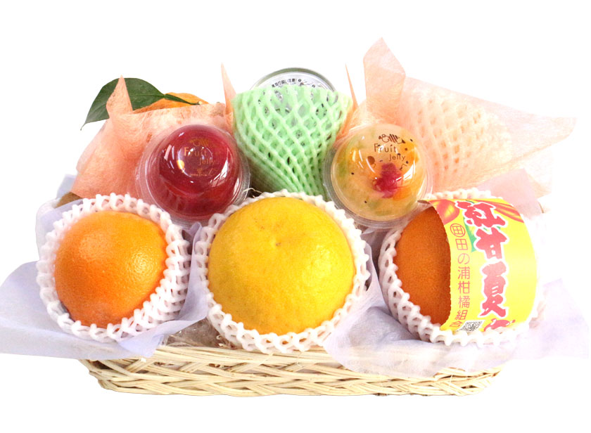 芳醇な香りの アンデスメロン 、柑橘の大トロとも呼ばれる せとか 、愛らしい見た目で食べやすさと美味しさを両立した デコポン 、爽やかな酸味とさっぱりした甘さの 日向夏 、さっぱりした上品な甘みの サウスオレンジ といった旬の柑橘、人気の サンふじりんご 、栄養満点のキウイ 2種といった果物類に、見た目も華やかな 国産フルーツゼリー 、素材にこだわった 国産フルーツ缶詰 を平カゴに盛り合わせました。