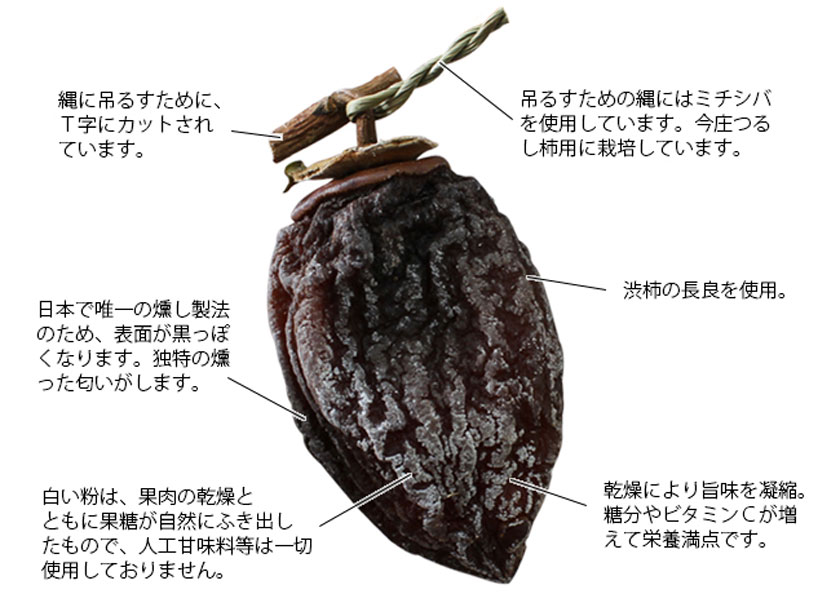 収穫した渋柿を、数日間煙で燻してから天日干しにして仕上げる、全国でも唯一といわれる燻し製法の干し柿です。