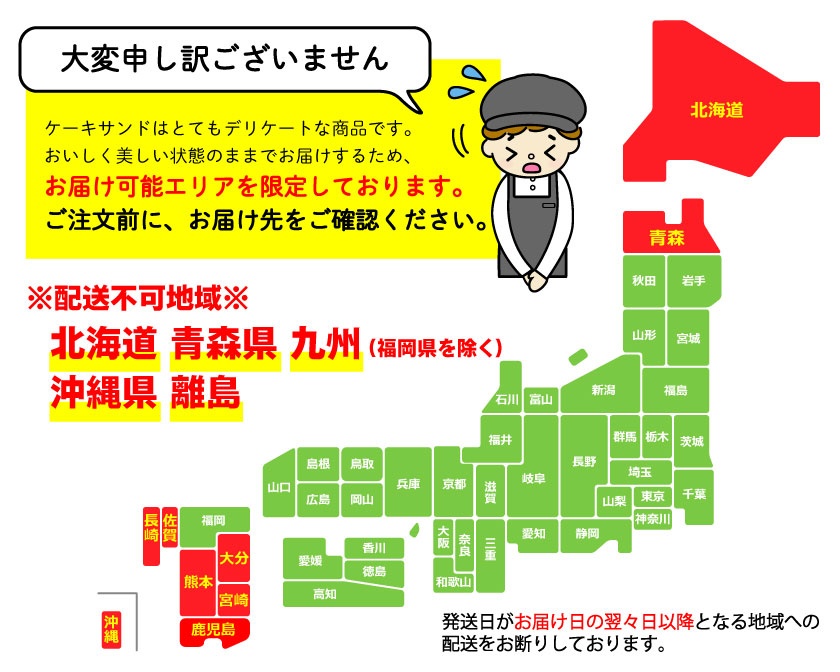 | 配送 | 冷蔵便 ※北海道、青森県、沖縄県、九州全県(福岡県を除く)は配達不可の地域です。 誠に申し訳ございませんが、ご了承下さいませ。 |