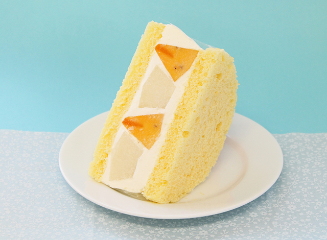 ふわふわケーキ生地に甘さ控えめの生クリーム。梨と柿のコラボレーションです。